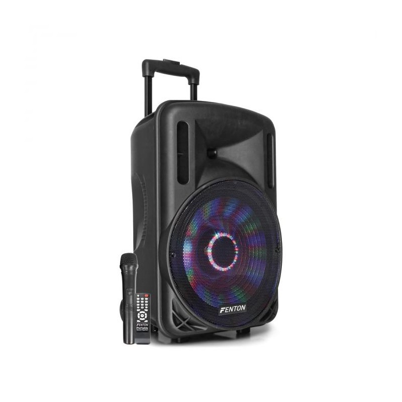 La cassa attiva FT12LED di Fenton garantisce bassi potenti con il suo subwoofer da 12", alti puliti con il tweeter da 1" e una potenza di uscita di 700 W. L'ascolto può avvenire tramite Bluetooth da smartphone o tablet, da lettori esterni tramite USB o SD, oppure collegando l'ingresso AUX a impianti stereo, lettori CD o radio. L'illuminazione LED integrata nel woofer crea il sottofondo ideale per ogni tipo di festa. Il sound può essere gestito grazia alla possibilità di regolare separatamente alti, bassi, eco e volume del microfono e volume master.